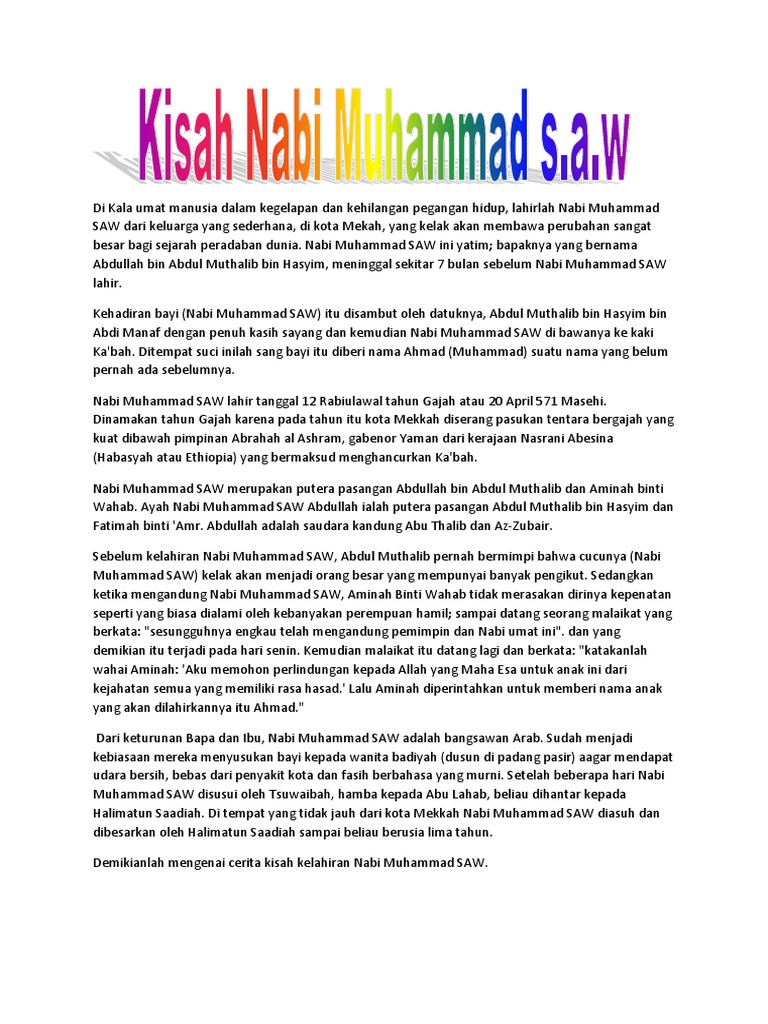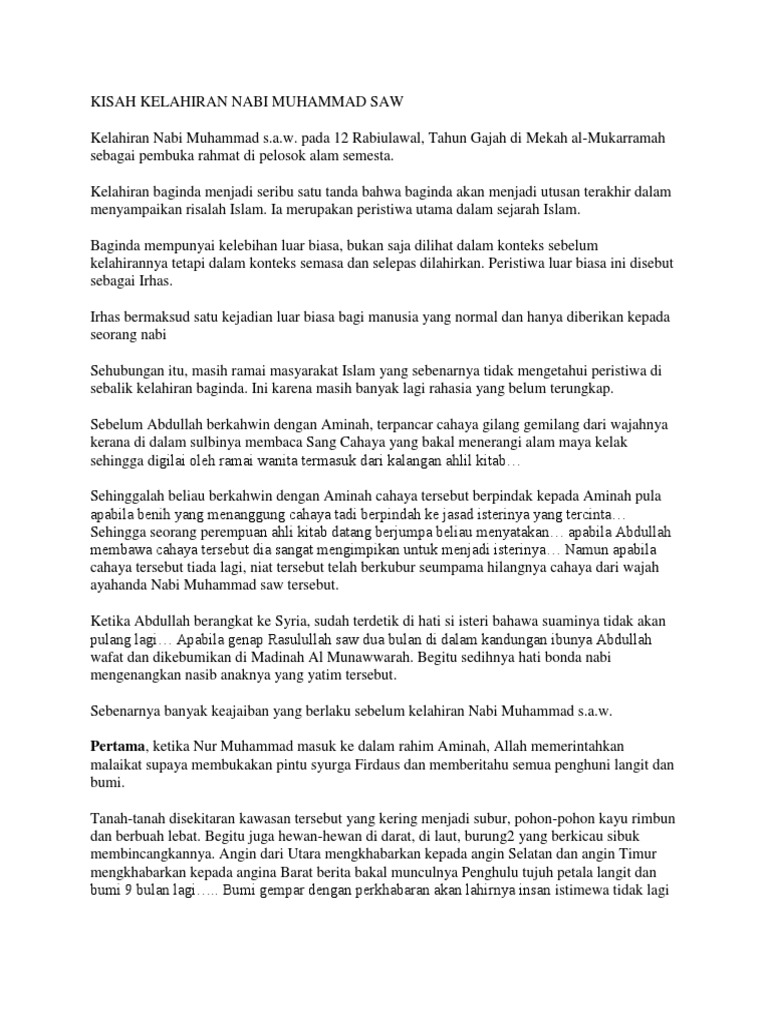Kisah kehidupan beliau bukan hanya untuk dibaca atau. Baginda junjungan adalah nur / cahaya. Allahumma solli 'ala saiyidina muhammadin 'abdika wa nabiyyika wa rosulikan nabiyyil ummiyyi wa 'ala alihi wasohbihi wa sallim. Begitulah sekelumit sejarah singkat kelahiran nabi muhammad saw. Dalam waktu yang sama, pada malam kelahiran nabi muhammad, tasik sava atau semenanjung yang dianggap suci oleh orang.